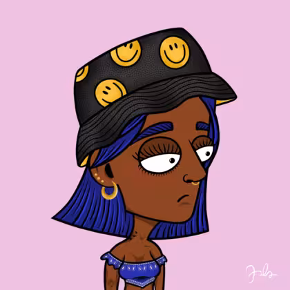 Collection Depressed Citizens Artist Juls Description ART. No team, no project, no future. Depressed Citizens is an urban & existential Art expression on Ordinals. In a parallel universe, "THEI" control us. DC unites against toxic society, encouraging critical thinking. 100% hand made collection that took Juls more than 6 months of daily work. Name Citizen#2759 Origin African descendant Gender Woman Necklace No Necklace Hat Smiley bucket hat Mustache Beard No beard Glasses No Glasses Earrings Ball earrings trio Hair Style Short straight Clothes Blue bandana crop top Tattoo Rose tattoo Star Background Without stars