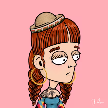Collection Depressed Citizens Artist Juls Description ART. No team, no project, no future. Depressed Citizens is an urban & existential Art expression on Ordinals. In a parallel universe, "THEI" control us. DC unites against toxic society, encouraging critical thinking. 100% hand made collection that took Juls more than 6 months of daily work. Name Citizen#106 Origin Caucasian non hispanic Gender Woman Necklace No Necklace Hat Straw bowler hat Mustache Beard No beard Glasses No Glasses Earrings Helix ring trio Hair Style Double braids with bangs Clothes Abstract flowers blue blouse Tattoo Maya tattoo Star Background Without stars